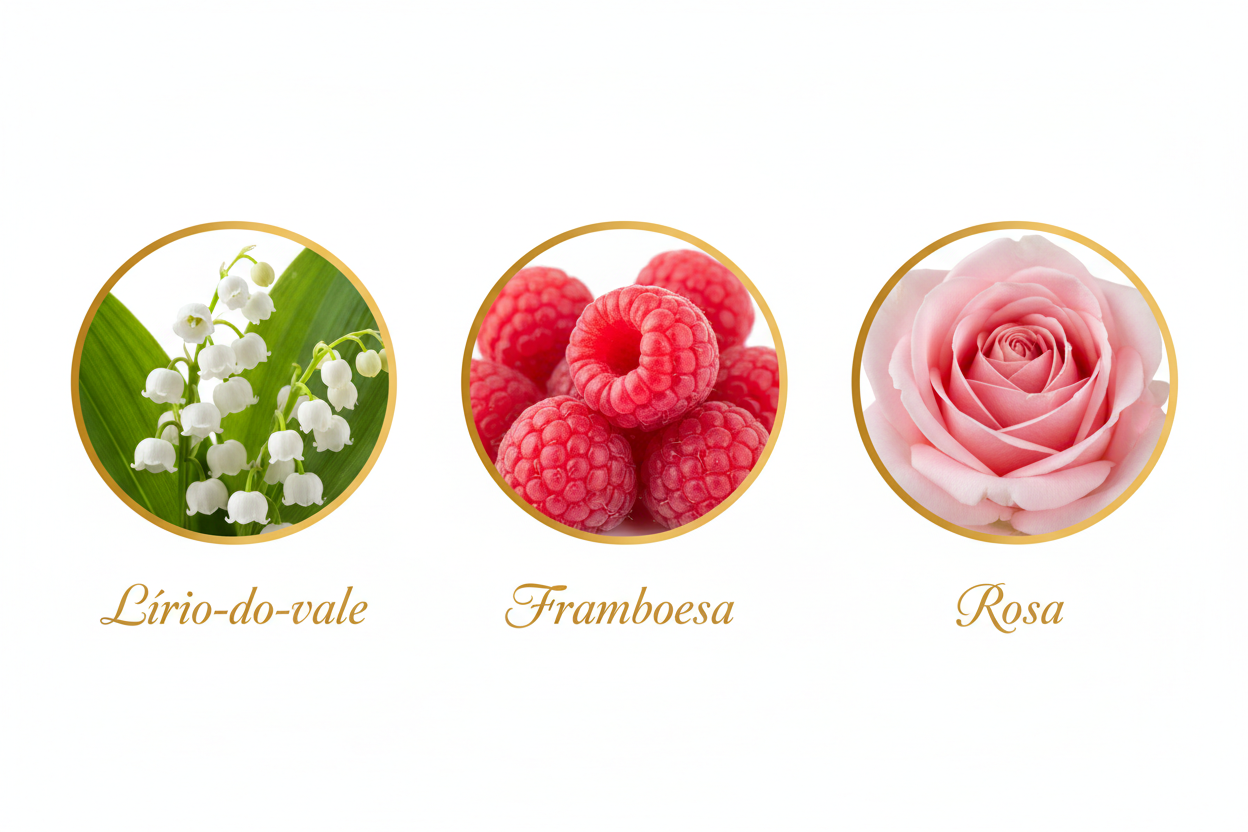 Um aroma floral romântico que combina a pureza do lírio-do-vale com a doçura da framboesa e a elegância da rosa.