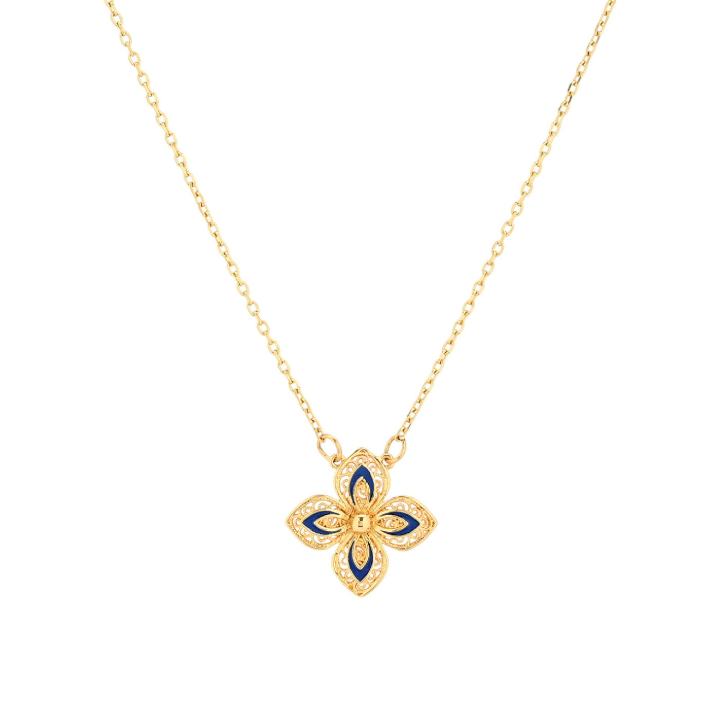 Da coleção Alma de Portugal, este colar apresenta uma flor azul vibrante que captura a essência da filigrana portuguesa reinterpretada com design moderno. Fabricado em liga de metais reciclados com banho de ouro, combina sustentabilidade com elegância atemporal.