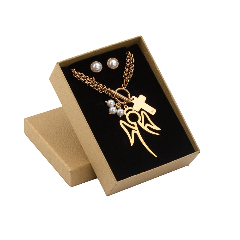 Conjunto completo com 2 peças coordenadas com motivos de anjo e cruz que simbolizam proteção e fé. Acabamento polido em aço inoxidável que garante brilho duradouro e resistência ao desgaste. Design delicado e espiritual, ideal para usar em conjunto ou separadamente. Leve e confortável para uso diário.