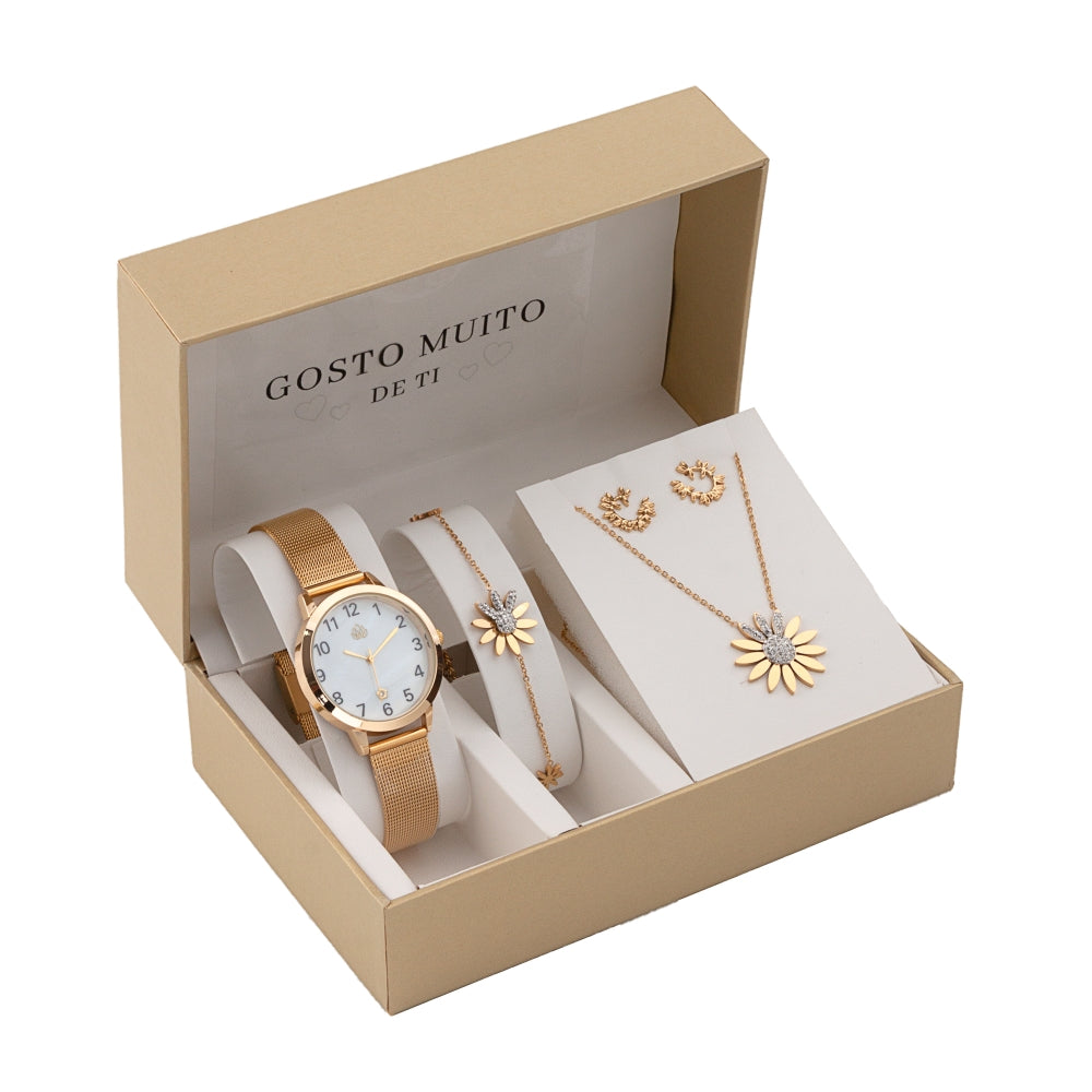 Conjunto completo com 4 peças coordenadas com flor delicada cravejada de zircónias brilhantes e mensagem "Gosto Muito de Ti". Acabamento polido em aço inoxidável que garante brilho duradouro e resistência ao desgaste. Design romântico e feminino com detalhes brilhantes, ideal para usar em conjunto ou separadamente. Leve e confortável para uso diário.
