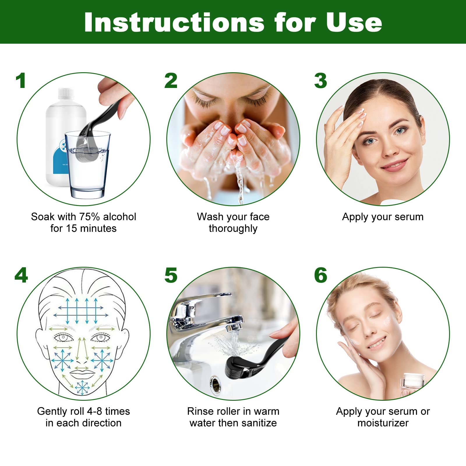 Limpar e desinfetar o dermaroller antes de cada uso. Limpar e secar bem o rosto. Aplicar sérum ou produto de tratamento na pele. Rolar o dermaroller suavemente sobre a pele em diferentes direções (vertical, horizontal e diagonal) 4-5 vezes em cada área. Não pressionar demasiado. Aplicar sérum calmante após o tratamento. Limpar e desinfetar o dermaroller após uso. Usar 1-2 vezes por semana. Não partilhar com outras pessoas.